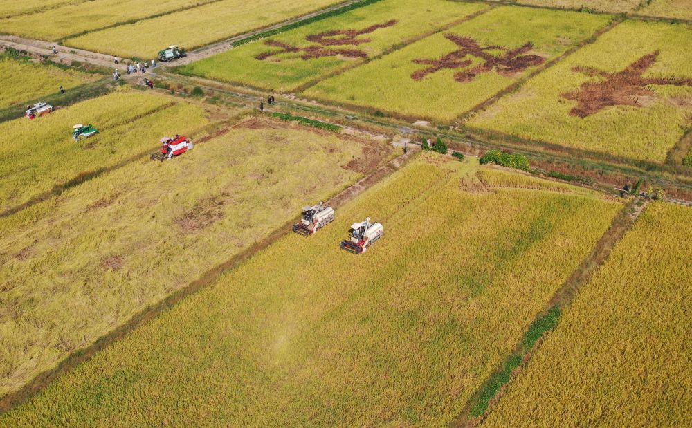 圖為2021年9月22日,在湖南省衡陽(yáng)市衡陽(yáng)縣庫(kù)宗橋鎮(zhèn),農(nóng)機(jī)手駕駛農(nóng)機(jī)收割稻谷(無(wú)人機(jī)照片)。 新華社記者趙眾志 攝