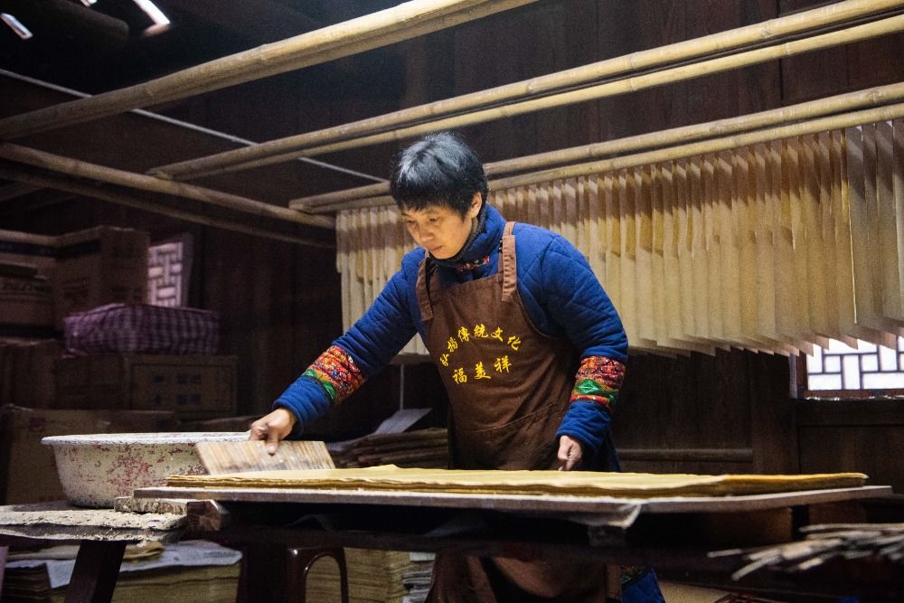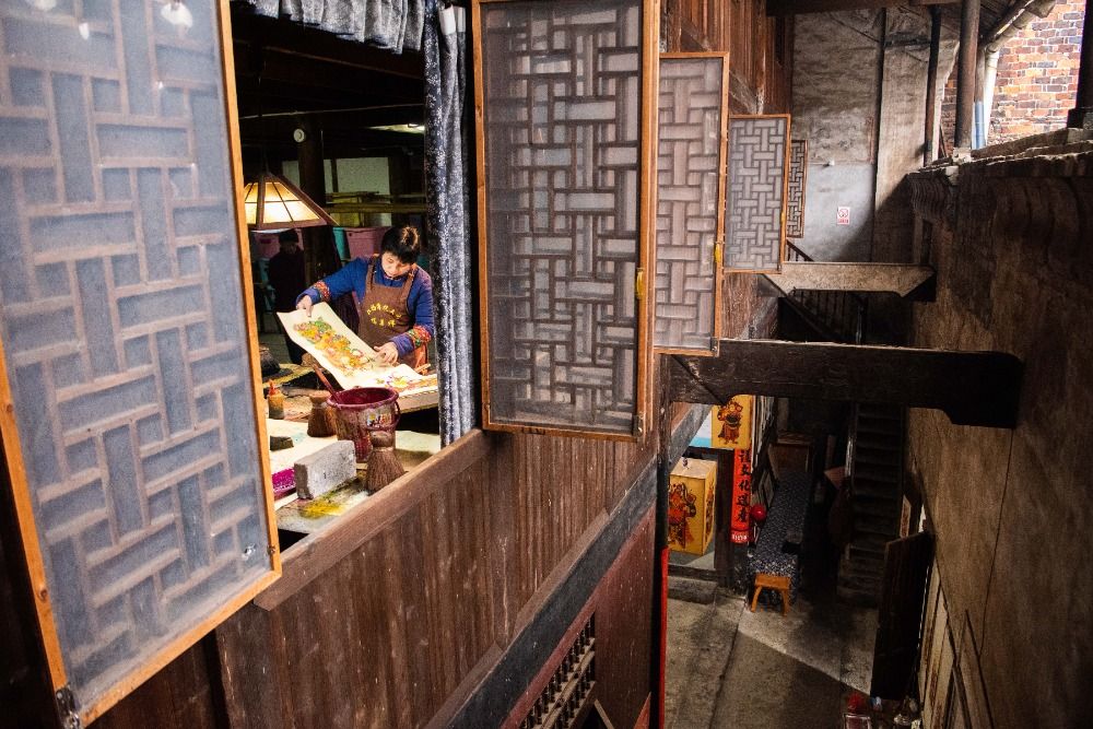 1月21日,在灘頭鎮(zhèn)一家年畫作坊,年畫藝人尹冬香在檢查年畫質(zhì)量。