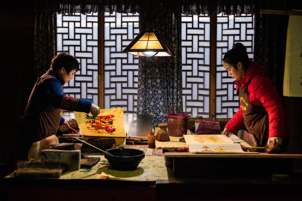 1月21日,在灘頭鎮(zhèn)一家年畫作坊,年畫藝人尹冬香(左)和女兒肖揚(yáng)在印制年畫。