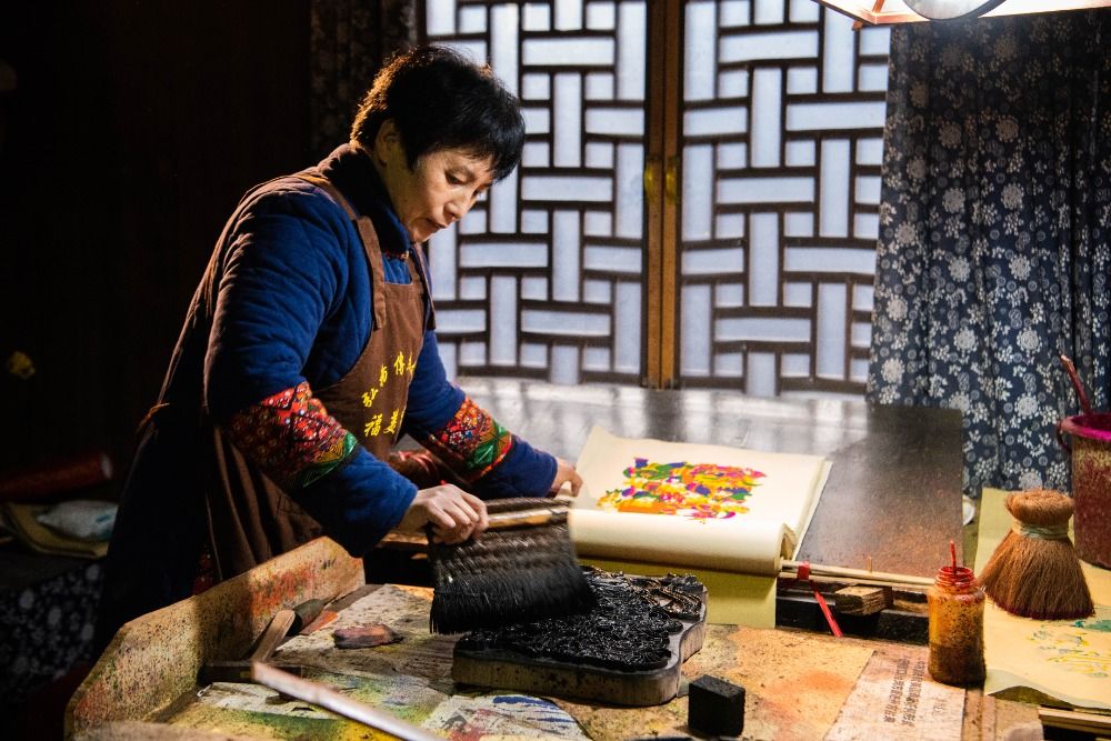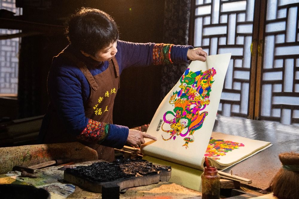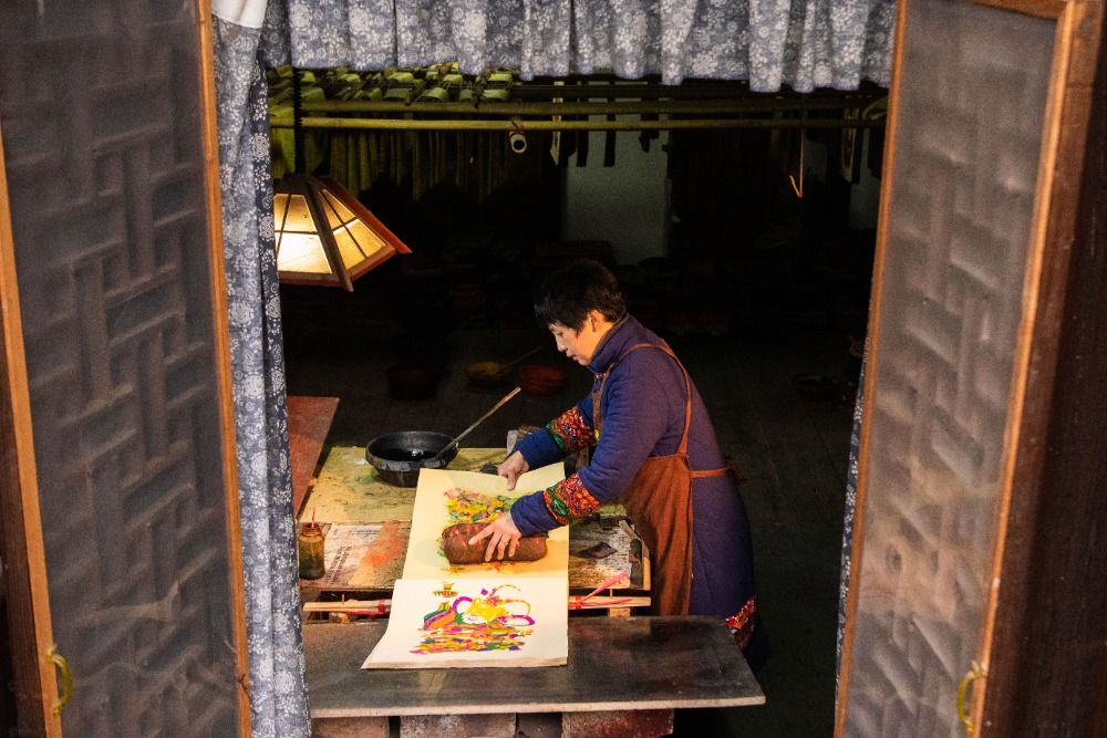 1月21日,在灘頭鎮(zhèn)一家年畫作坊,年畫藝人尹冬香在印制年畫。