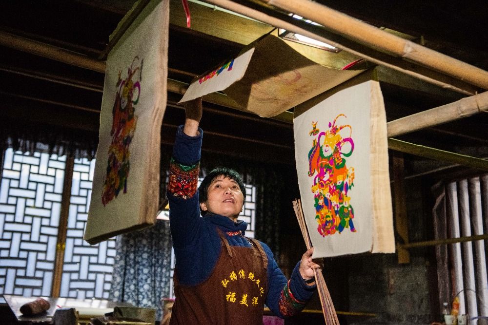 1月21日,在灘頭鎮(zhèn)一家年畫作坊,年畫藝人尹冬香在晾曬年畫。