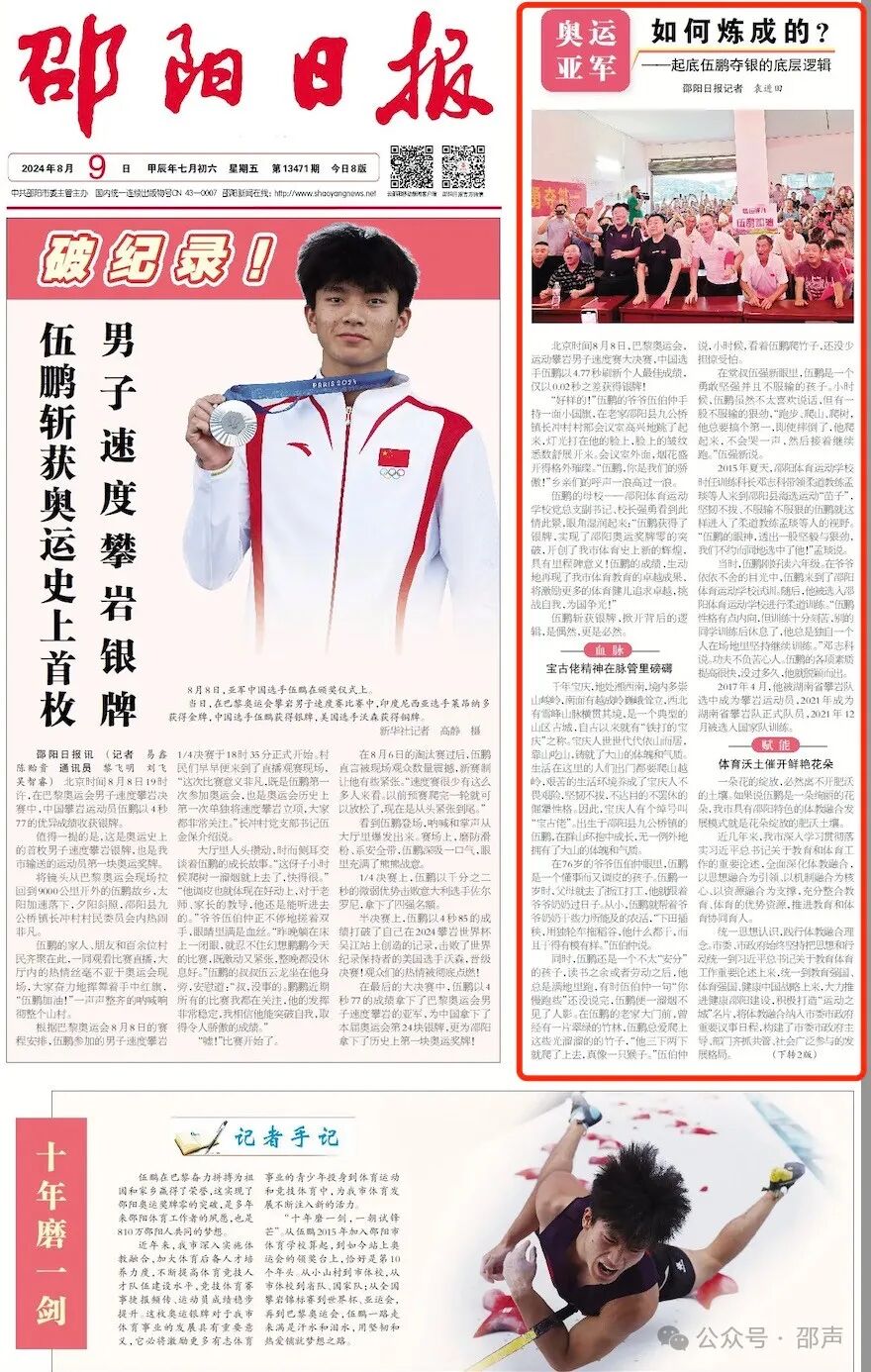 伍鵬的母?!坳栿w育運(yùn)動學(xué)校黨總支副書記、校長強(qiáng)勇看到此情此景,眼角濕潤起來:“伍鵬獲得了銀牌,實(shí)現(xiàn)了邵陽奧運(yùn)獎牌零的突破,開創(chuàng)了邵陽市體育史上新的輝煌,具有里程碑意義!伍鵬的成績,生動地再現(xiàn)了邵陽市體育教育的卓越成果,將激勵更多的體育健兒追求卓越,挑戰(zhàn)自我,為國爭光!”