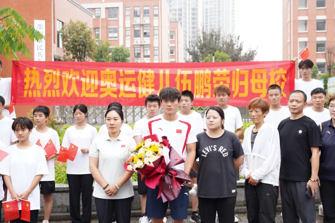 在伍鵬母校邵陽體育運動學(xué)校門口,親友、師生以及聞訊而來的媒體記者早已匯聚一堂,手捧鮮花,共同期待著這位奧運健將的歸來?!皻g迎伍鵬回家!”13時30分許,隨著伍鵬步入校門,現(xiàn)場爆發(fā)出雷鳴般的掌聲和歡呼聲。
