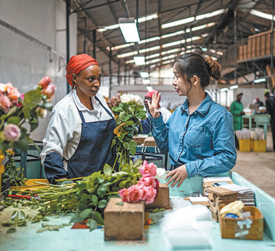 中國一家貿(mào)易公司的代表(右)在肯尼亞納紐基的坦布濟花卉農(nóng)場采購鮮花?! ⌒氯A社記者 王冠森攝