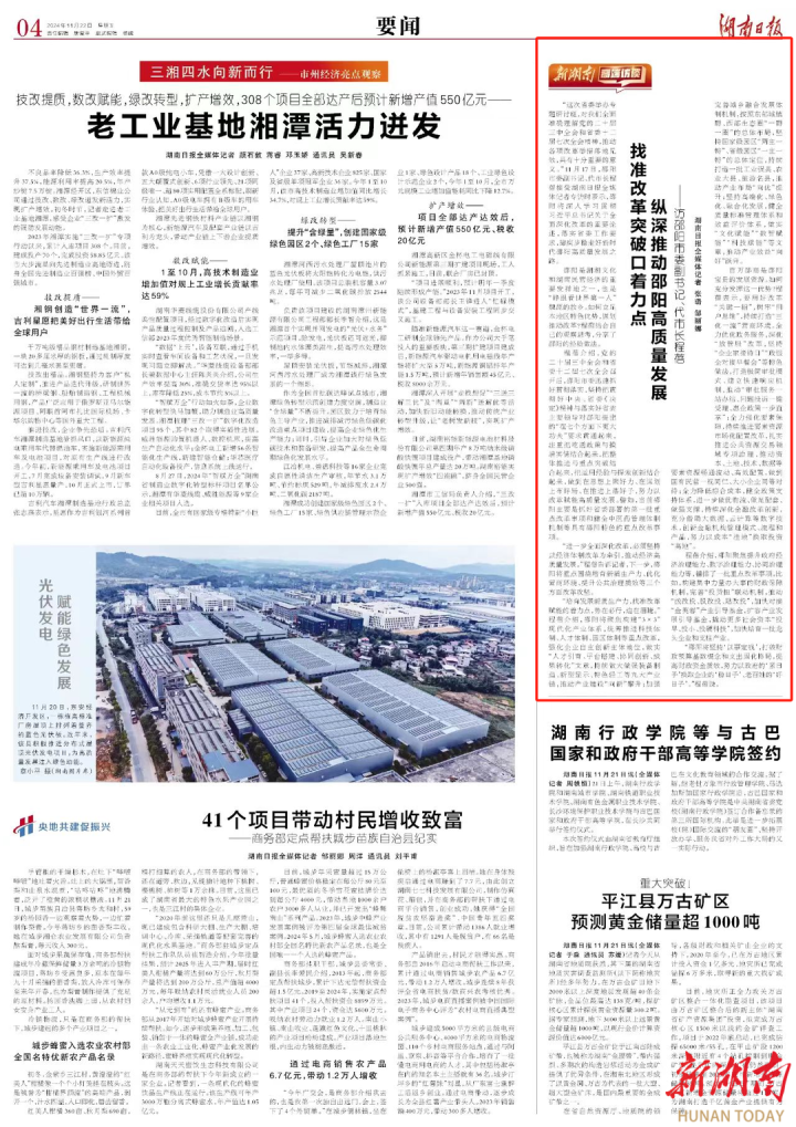 “培育發(fā)展新質(zhì)生產(chǎn)力,找準(zhǔn)改革賦能的著力點(diǎn),勢在必行,迫在眉睫。”程蓓介紹,邵陽將聚焦構(gòu)建“3×3”現(xiàn)代化產(chǎn)業(yè)體系,統(tǒng)籌推進(jìn)科技體制、人才體制、園區(qū)體制等重點(diǎn)改革,強(qiáng)化企業(yè)自主創(chuàng)新主體地位,做實(shí)“人才引育、平臺(tái)搭建、協(xié)同創(chuàng)新、成果轉(zhuǎn)化”文章,持續(xù)做大做強(qiáng)裝備制造、新型顯示、特色輕工等九大產(chǎn)業(yè)鏈,推動(dòng)產(chǎn)業(yè)建設(shè)“向新”攀升;加強(qiáng)完善城鄉(xiāng)融合發(fā)展體制機(jī)制,按照東部城鎮(zhèn)群、西部生態(tài)圈“一群一圈”的總體布局,堅(jiān)持國家級(jí)園區(qū)“兩主一特”、省級(jí)園區(qū)“一主一特”的總體定位,持續(xù)打造一批工業(yè)強(qiáng)縣、農(nóng)業(yè)大縣、旅游名縣,推動(dòng)產(chǎn)業(yè)布局“向優(yōu)”提升;堅(jiān)持高端化、綠色化、融合化發(fā)展,健全質(zhì)量標(biāo)準(zhǔn)管理體系和效益評(píng)價(jià)體系,做實(shí)“文化賦能”“數(shù)智賦能”“科技賦能”等文章,推動(dòng)產(chǎn)業(yè)效益“向好”躍升。