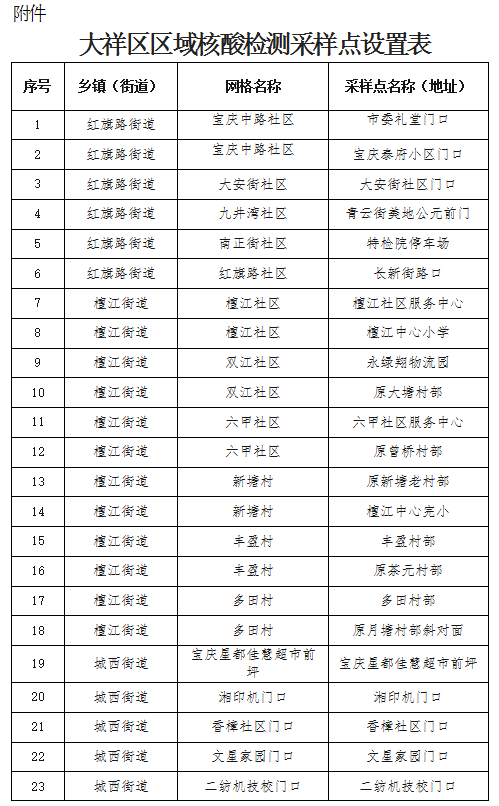 采樣地點詳見大祥區(qū)區(qū)域核酸檢測采樣點設(shè)置表(見附件)。附件公布的采樣點在采樣時間內(nèi)正常采樣,黃碼人員請注意按時就近選擇采樣點,不要聚集在人多的采樣點。