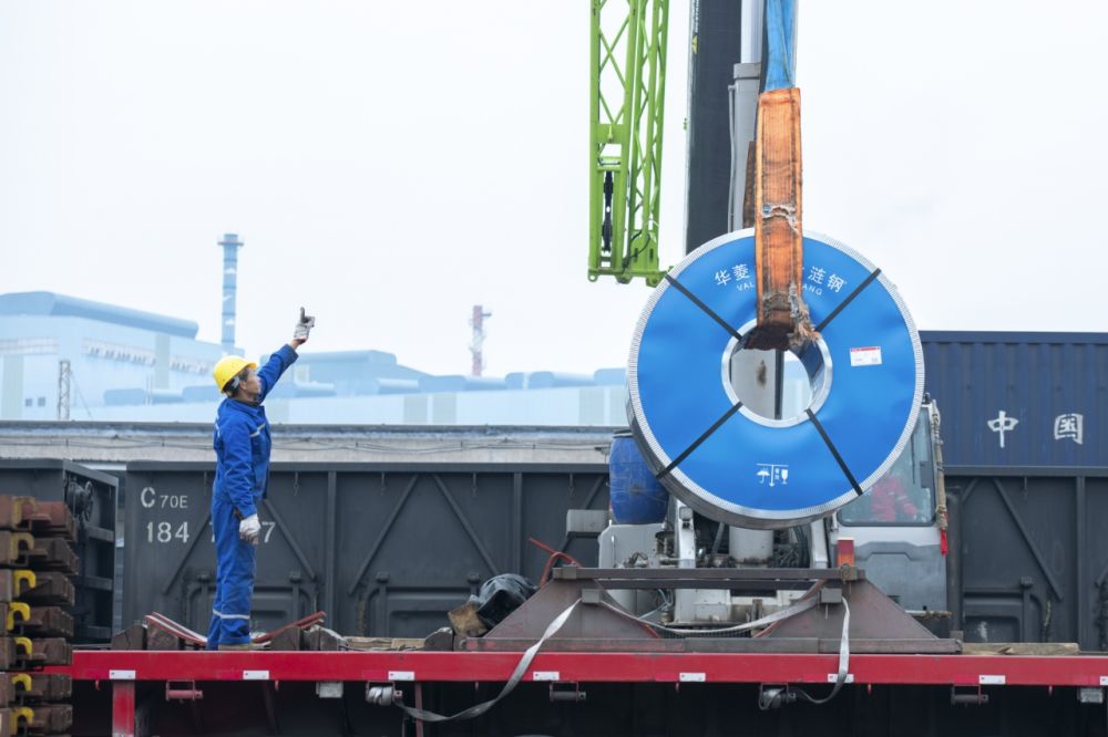 2月5日,工人操控吊車在湖南省婁底東站貨場(chǎng)裝運(yùn)硅鋼卷材。吳永華 攝