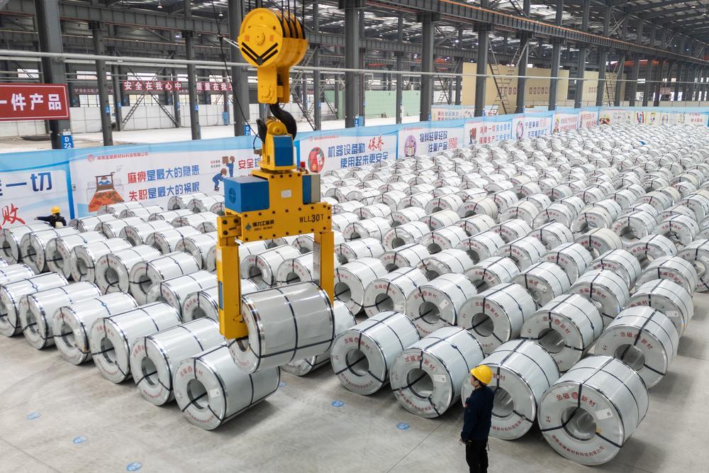 2月6日,湖南省婁底經(jīng)開區(qū)薄板產(chǎn)業(yè)園的湖南金磁新材料科技有限公司,工人操控行車搬運(yùn)硅鋼卷材(無人機(jī)照片)。吳永華 攝