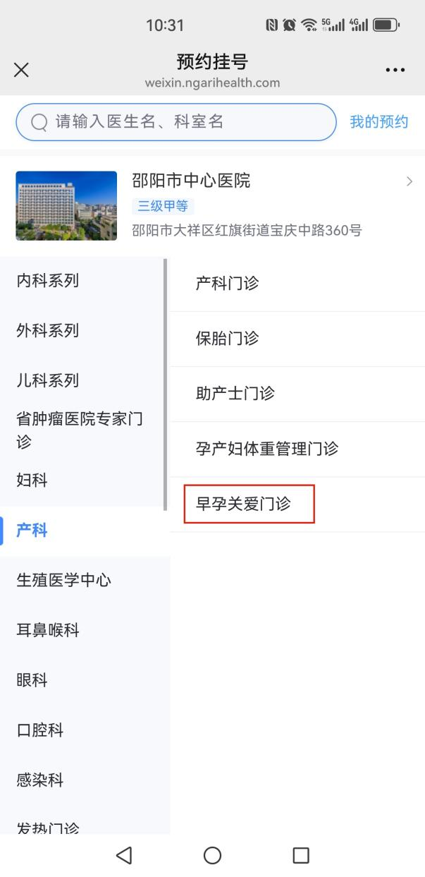 掛號(hào):關(guān)注“邵陽(yáng)市中心醫(yī)院”服務(wù)號(hào),點(diǎn)擊“醫(yī)院就診”→“門(mén)診掛號(hào)”→“產(chǎn)科”→“早孕關(guān)愛(ài)門(mén)診”